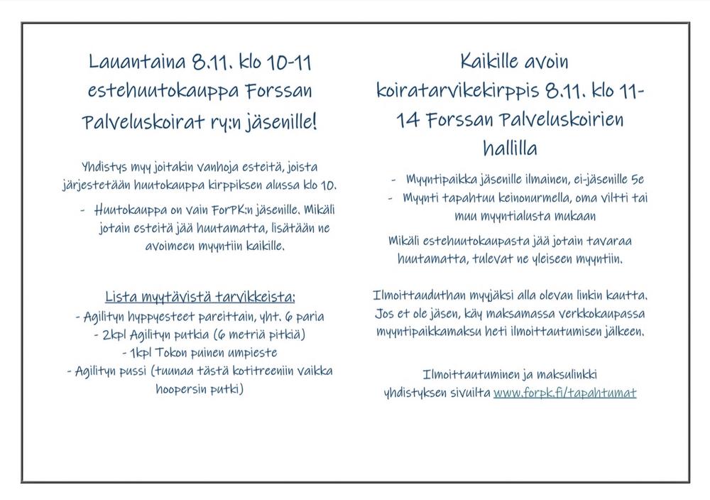 Nyt on aika tehdä syyssiivous ja kaivaa tarpeettomat koiratarvikkeet kaappien nurkista, sillä Forssan Palveluskoirat ry järjestää 1.11. lauantaina koiratarvikekirppiksen hallilla klo 11-14.
