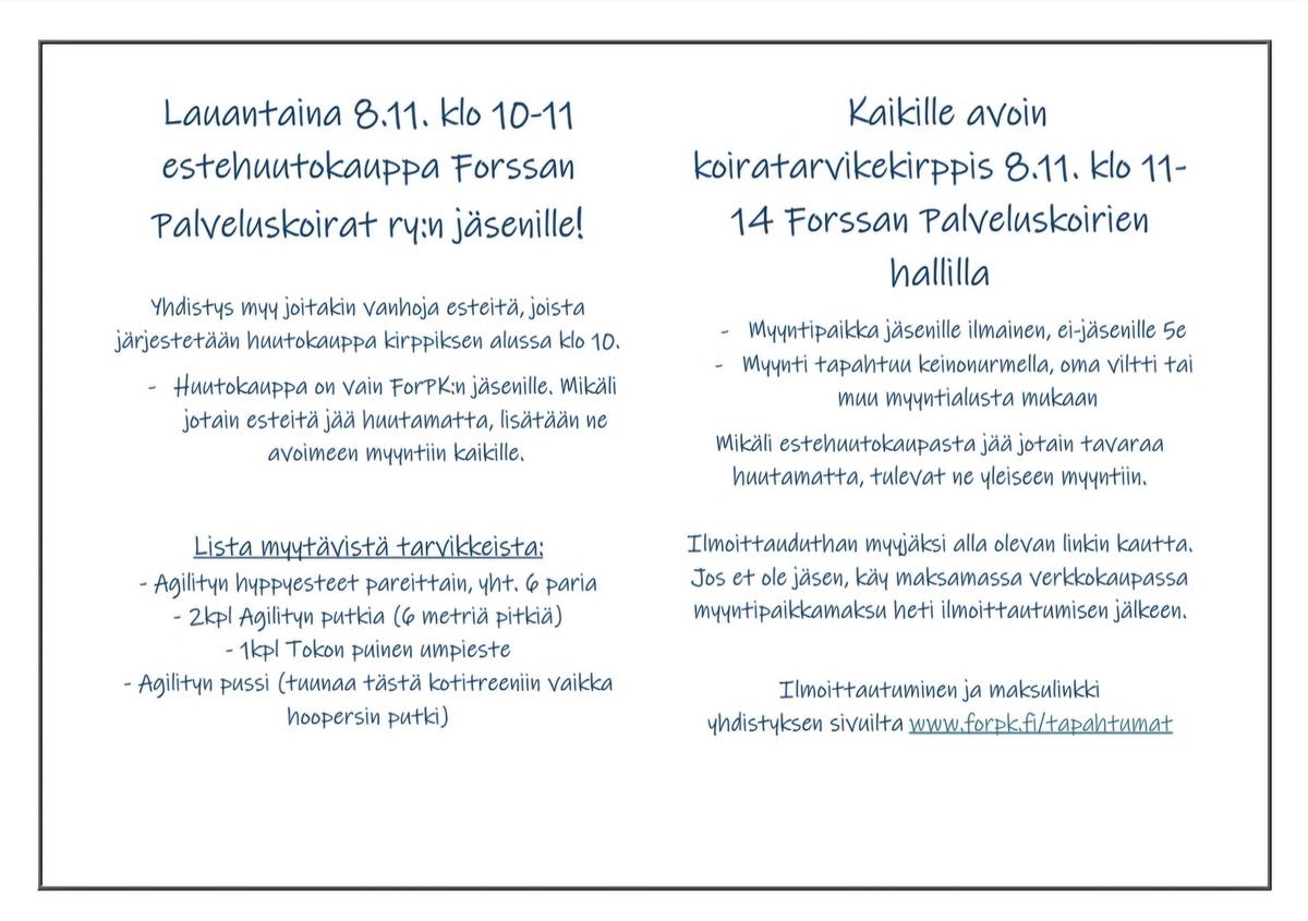 Nyt on aika tehdä syyssiivous ja kaivaa tarpeettomat koiratarvikkeet kaappien nurkista, sillä Forssan Palveluskoirat ry järjestää 1.11. lauantaina koiratarvikekirppiksen hallilla klo 11-14.